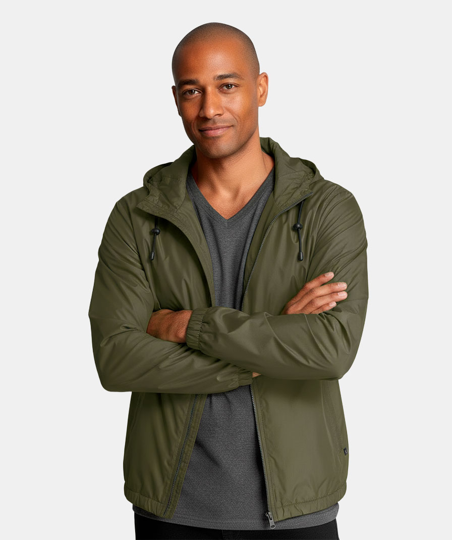 Casaco impermeável leve com fecho de correr frontal. Protetor de queixo. Capuz removível com fecho de correr e ajustes elásticos. Punhos em borracha. Bolsos laterais com fecho de correr e debrum no mesmo tecido. Bolso interior no lado esquerdo do peito. Forro interior em microfibra a condizer.